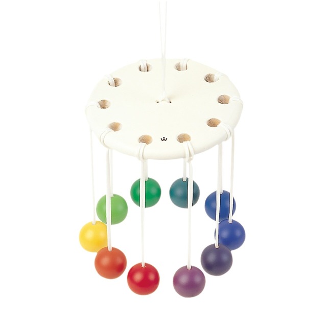 赤ちゃんの手にスッポリ入るやさしい丸いかたちの吊りメリー。回転させると10色の虹色の輪が広がります。 【サイズ】 円盤直径:135㎜ 球直径:30㎜ 【材質】 円盤:MDF 球:ミズキ、ナイロン紐